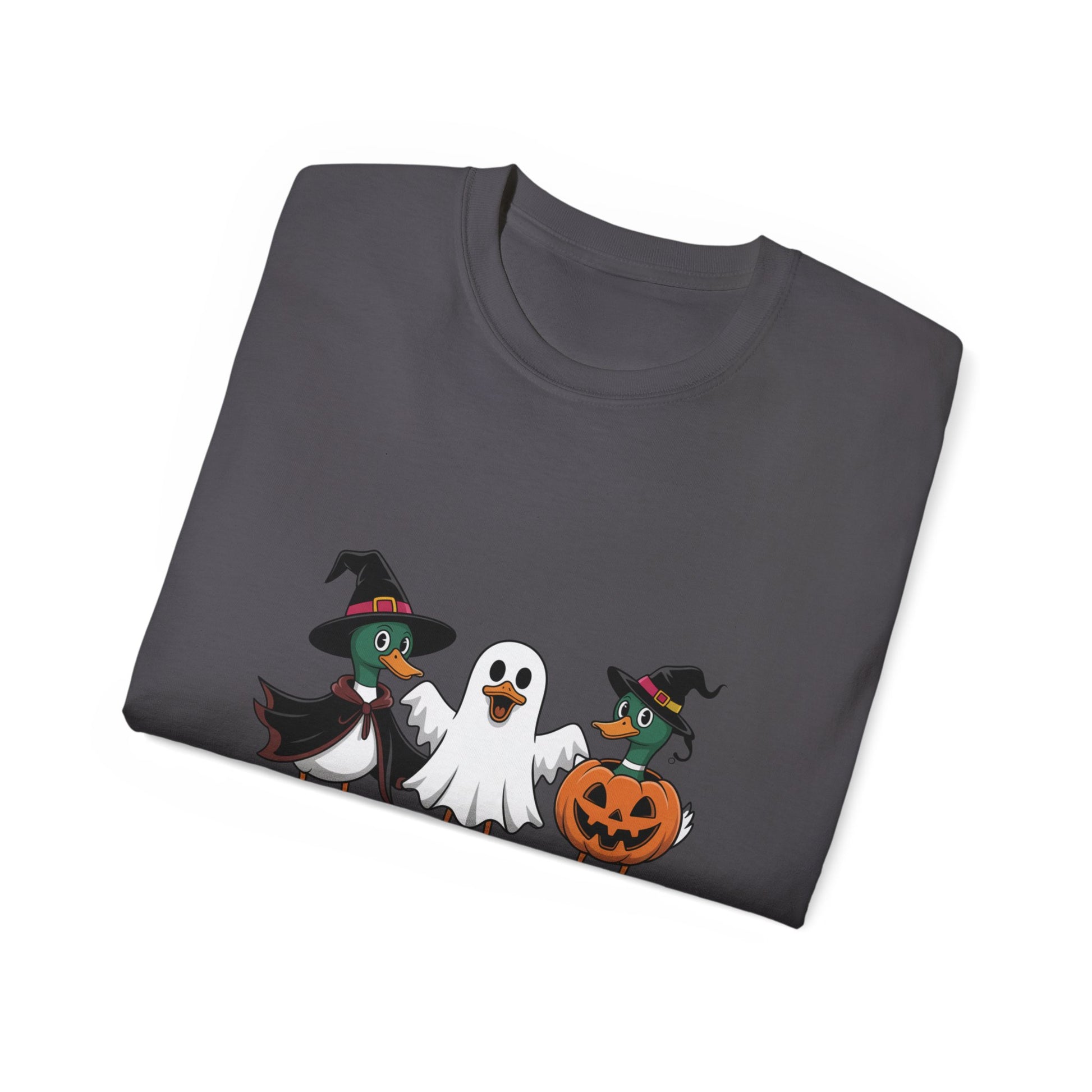 Featuring three cute ducks dressed as a ghost, witch, and pumpkin, this funny t-shirt is perfect for anyone who loves ducks, humor, and Halloween vibes.